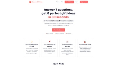 Discover perfect gift ideas fast. Answer 7 questions and get 8 AI-powered recommendations for any person, budget, or occasion. Free to try.