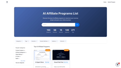 Explore leading AI affiliate programs across categories, industries, payment options, tags, audiences and networks—boost earnings with our SEO-optimized directory.